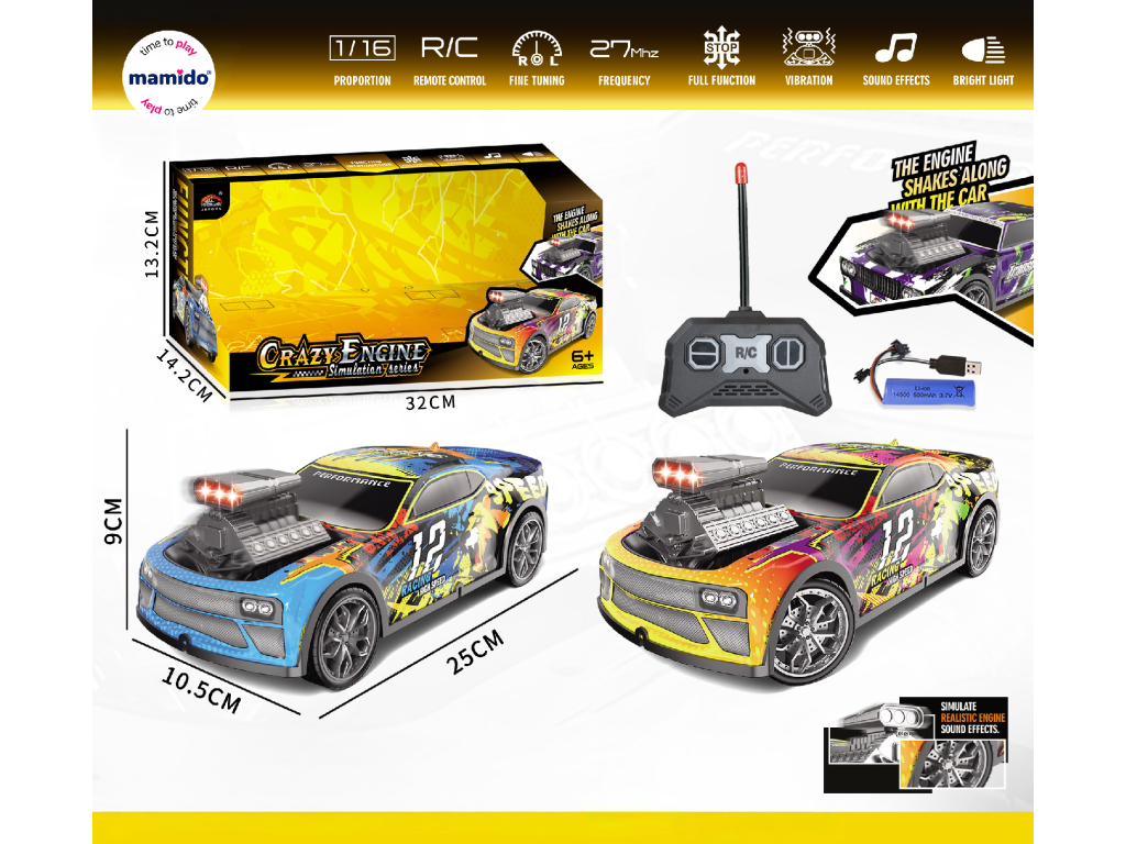 Stylový RC model auta v měřítku 1:16 přináší realistický zážitek z jízdy. Díky funkci vibrací motoru, světelným efektům a zvukům připomíná skutečný závodní vůz. Auto se ovládá na frekvenci 27 MHz a nabízí plně funkční jízdu vpřed, vzad, vlevo i vpravo.