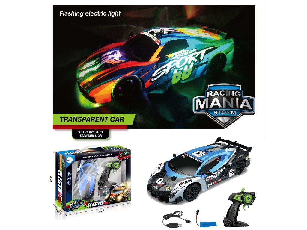 Auto na dálkové ovládání RC Racing Mania 1:18 přináší skvělý zážitek z jízdy díky unikátní transparentní karoserii s LED podsvícením, která září po celé ploše vozu. Sportovní design a aerodynamický tvar dodávají autu realistický vzhled závodního modelu.