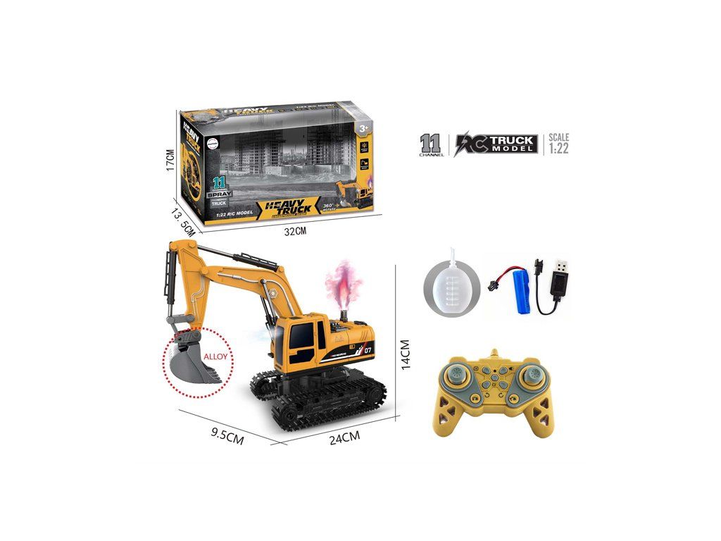 Realistická RC pásová bagrová hračka v měřítku 1:22 nabízí dětem vzrušující zážitek ze hry se stavební technikou. Model má kovovou lžíci, realistické světelné a zvukové efekty a speciální funkci kouře (spray efekt), která dodává hře ještě více autentičnosti. Díky 11kanálovému dálkovému ovládání lze bagr přesně ovládat – pohybovat ramenem, otáčet nástavbou, posouvat se dopředu, dozadu i do stran.