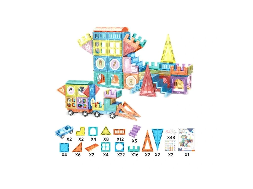 Stavebnice obsahuje 139 magnetických dílků různých tvarů – trojúhelníky, čtverce, oblouky, dlouhé panely, dekorativní okénka i speciální díly. Transparentní provedení v zářivých barvách podporuje vizuální vnímání a díky jednoduchému spojování si s ní poradí i menší děti. Ideální pro rozvoj kreativity, logického myšlení a prostorové představivosti.