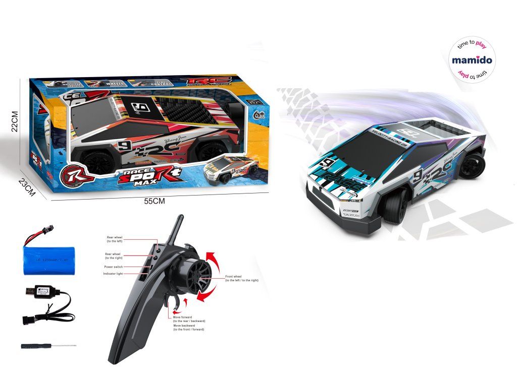 Auto na dálkové ovládání Race Sport Max v měřítku 1:10 je ideální volbou pro malé i větší fanoušky rychlé jízdy. Auto se ovládá pomocí ergonomického dálkového ovladače s volantem, díky kterému si děti snadno osvojí jízdu vpřed, vzad i zatáčení.