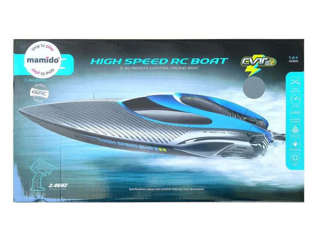 Loď je vybavena praktickými funkcemi – nastavení kormidla, trimování, voděodolné provedení, a také funkcí self-righting, která automaticky otočí loď zpět při převrácení. Nechybí ani indikátor nízkého stavu baterie a světelné efekty pro lepší viditelnost na vodě.